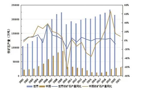 2001—2021年全球及中國鐵礦石產(chǎn)量對比