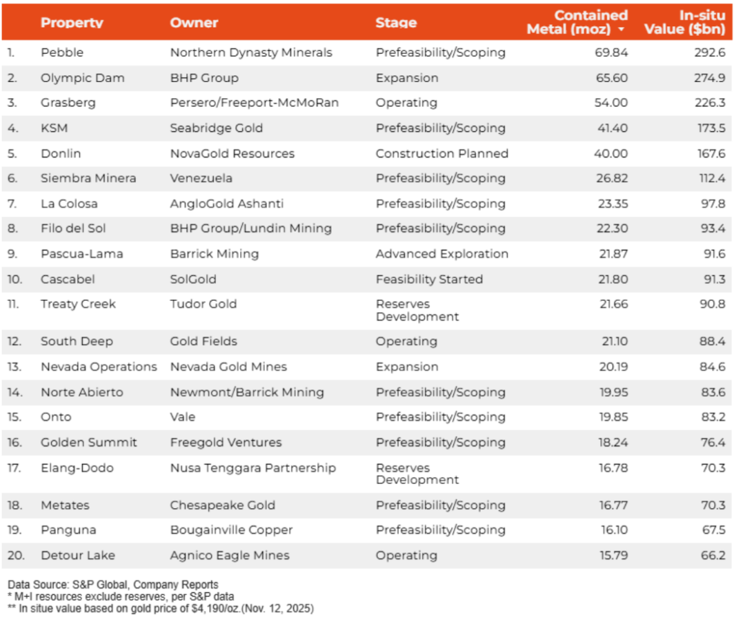 據(jù)minging.com統(tǒng)計(jì),排名第一的是北方皇朝礦產(chǎn)公司(NDM)的佩布爾(Pebble)金礦項(xiàng)目,該礦位于美國阿拉斯加州布里斯托灣附近,其中金資源量6984萬盎司,約等于2176.23噸。除了黃金之外,據(jù)估算,該礦山預(yù)測礦產(chǎn)資源量為2587.8萬噸的銅、154.36萬噸的鉬和3.45億盎司的銀,是世界上資源最豐富的礦床之一。但該項(xiàng)目已經(jīng)停滯了十多年,當(dāng)?shù)丨h(huán)保人士、居民和漁業(yè)人員堅(jiān)決反對(duì)開發(fā)Pebble礦山。